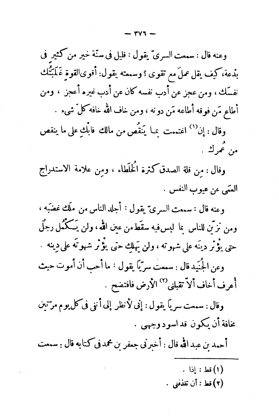 وعنه قال سمعت السري يقول قليل في سنة خير من كثير في بدعة كيف يقل عمل مع تقوى وسمعته يقول أقوى القوة غلبتك نفسك ومن عجز عن أدب نفسه كان عن أدب غيره أعجز ومن أطاع من فوقه أطاعه من دونه ومن خاف الله خافه كل شيء