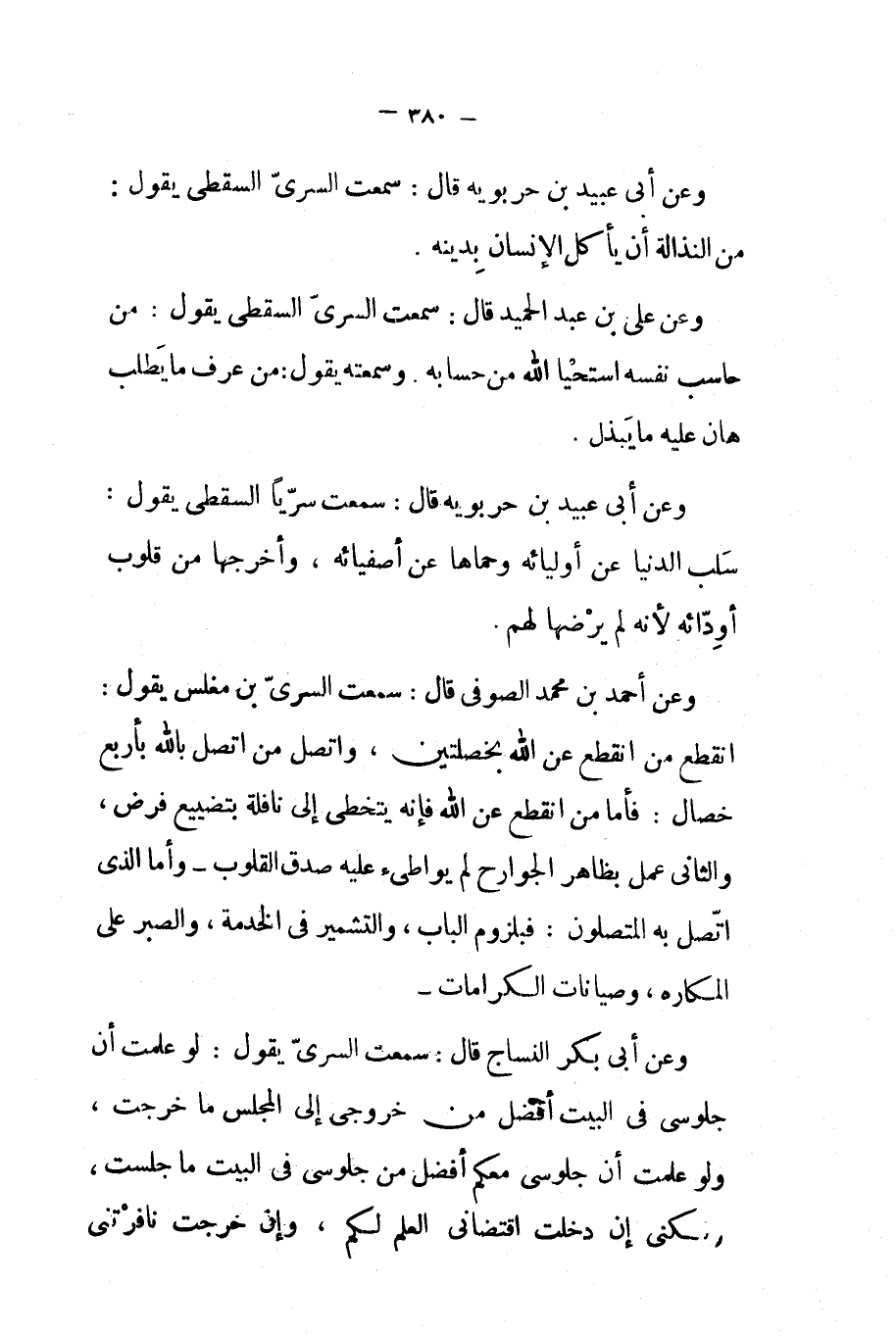 وعن أحمد بن محمد الصوفي قال سمعت السري بن مغلس يقول انقطع من انقطع عن الله بخصلتين واتصل من اتصل بالله بأربع خصال فأما من انقطع عن الله فإنه يتخطى إلى نافلة بتضييع فرض والثاني عمل بظاهر الجوارح لم يواطىء عليه صدق القلوب وأما الذي إتصل به المتصلون فبلزوم الباب والتشمير في الخدمة والصبر على المكاره وصيانات الكرامات