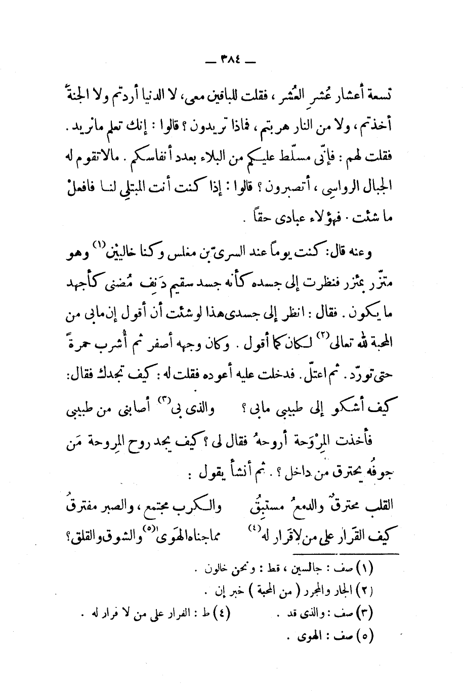 وعنه قال كنت يوما عند السري بن مغلس وكنا خاليين وهو متزر بمئزر فنظرت إلى جسده كأنه جسد سقيم دنف مضنى كأجهد ما يكون فقال أنظر إلى جسدي هذا لو شئت أن أقول إن ما بي من المحبة لله تعالى لكان كما أقول وكان وجهه أصفر ثم أشرب حمرة حتى تورد ثم اعتل فدخلت عليه أعوده فقلت له كيف تجدك فقال