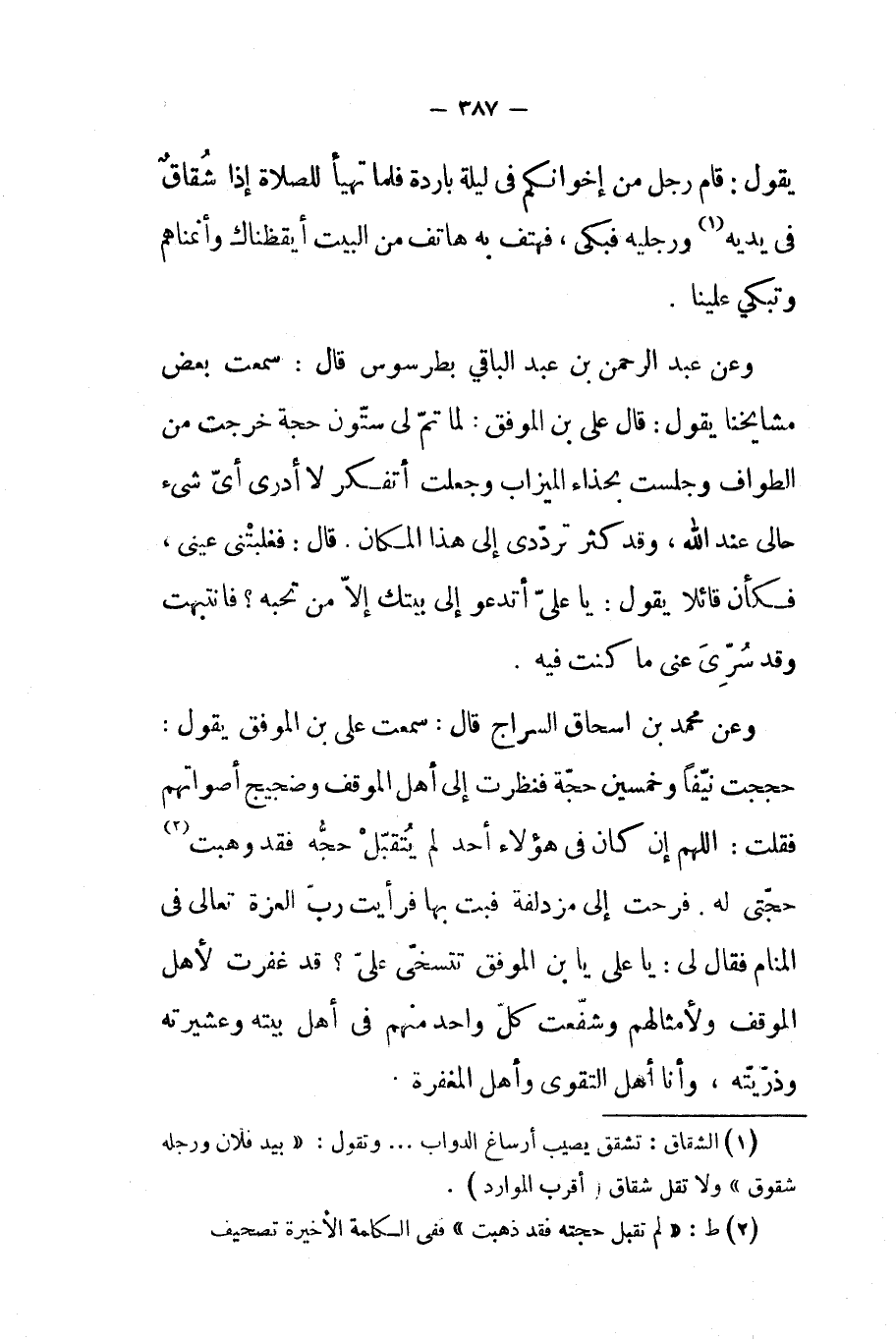 وعن عبد الرحمن بن عبد الباقي بطرسوس قال سمعت بعض مشايخنا يقول قال علي بن الموفق لما تم لي ستون حجة خرجت من الطواف وجلست بحذاء الميزاب وجعلت أتفكر لا أدري أي شيء حالي عند الله وقد كثر ترددي إلى هذا المكان قال فغلبتني عيني فكأن قائلا يقول يا علي أتدعو إلى بيتك إلا من تحبه فأنتبهت وقد سري عني ما كنت فيه