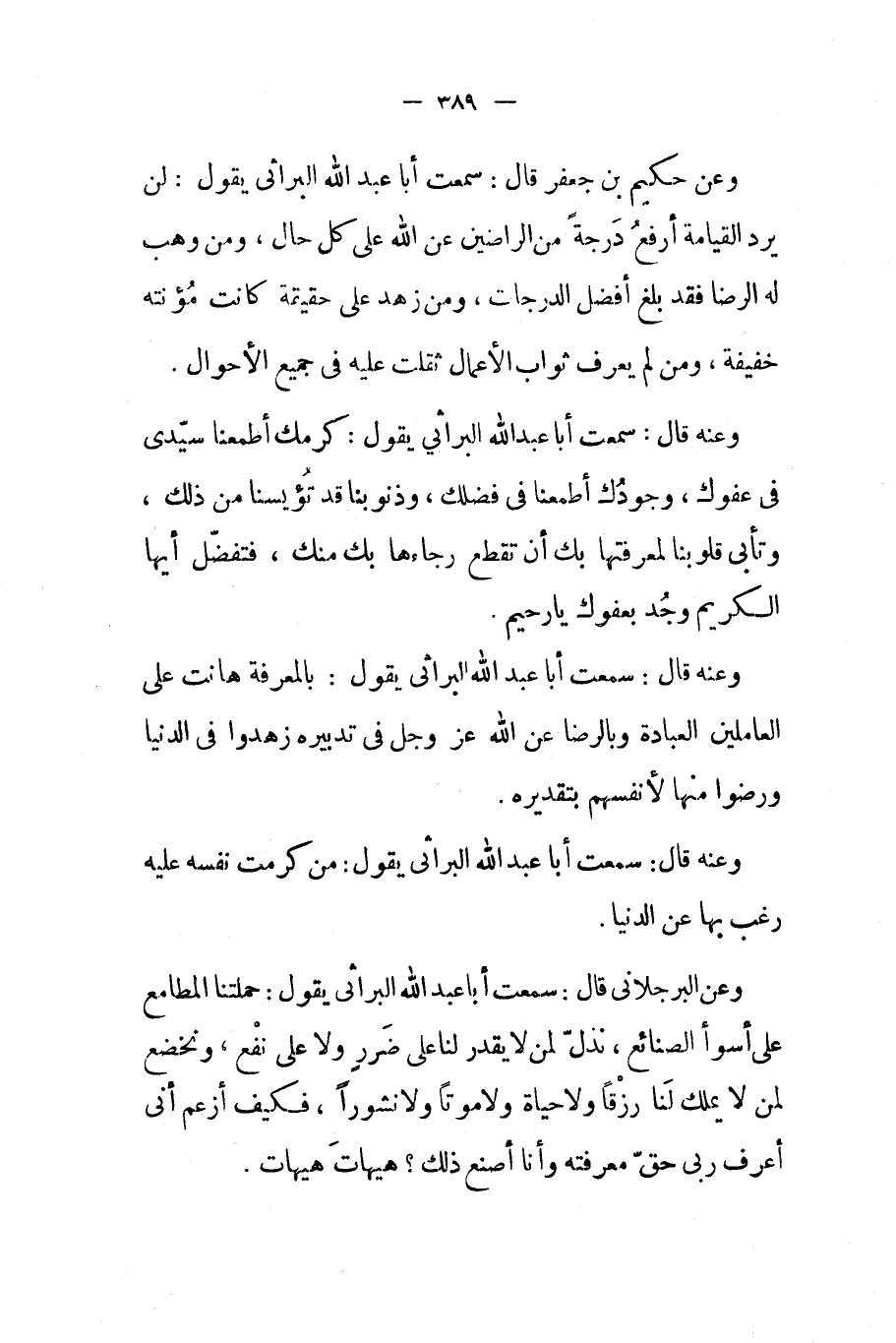 وعنه قال سمعت أبا عبد الله البراثي يقول بالمعرفة هانت على العاملين العبادة وبالرضا عن الله عز و جل في تدبيره زهدوا في الدنيا ورضوا منها لأنفسهم بتقديره