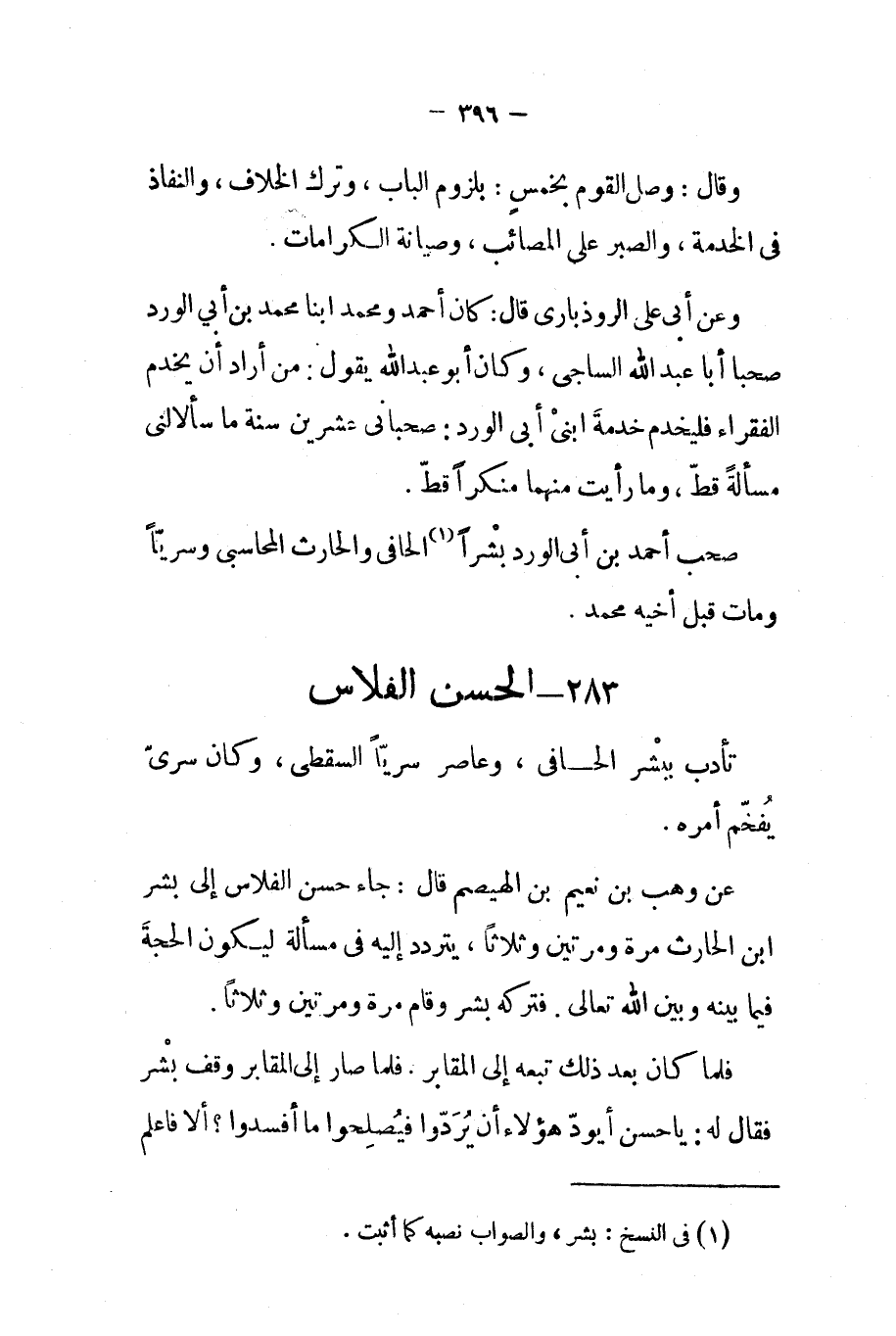 عن وهب بن نعيم بن الهيصم قال جاء حسن الفلاس إلى بشر إبن الحارث مرة ومرتين وثلاثا يتردد إليه في مسألة ليكون الحجة فيما بينه وبين الله تعالى فتركه بشر وقام مرة ومرتين وثلاثا