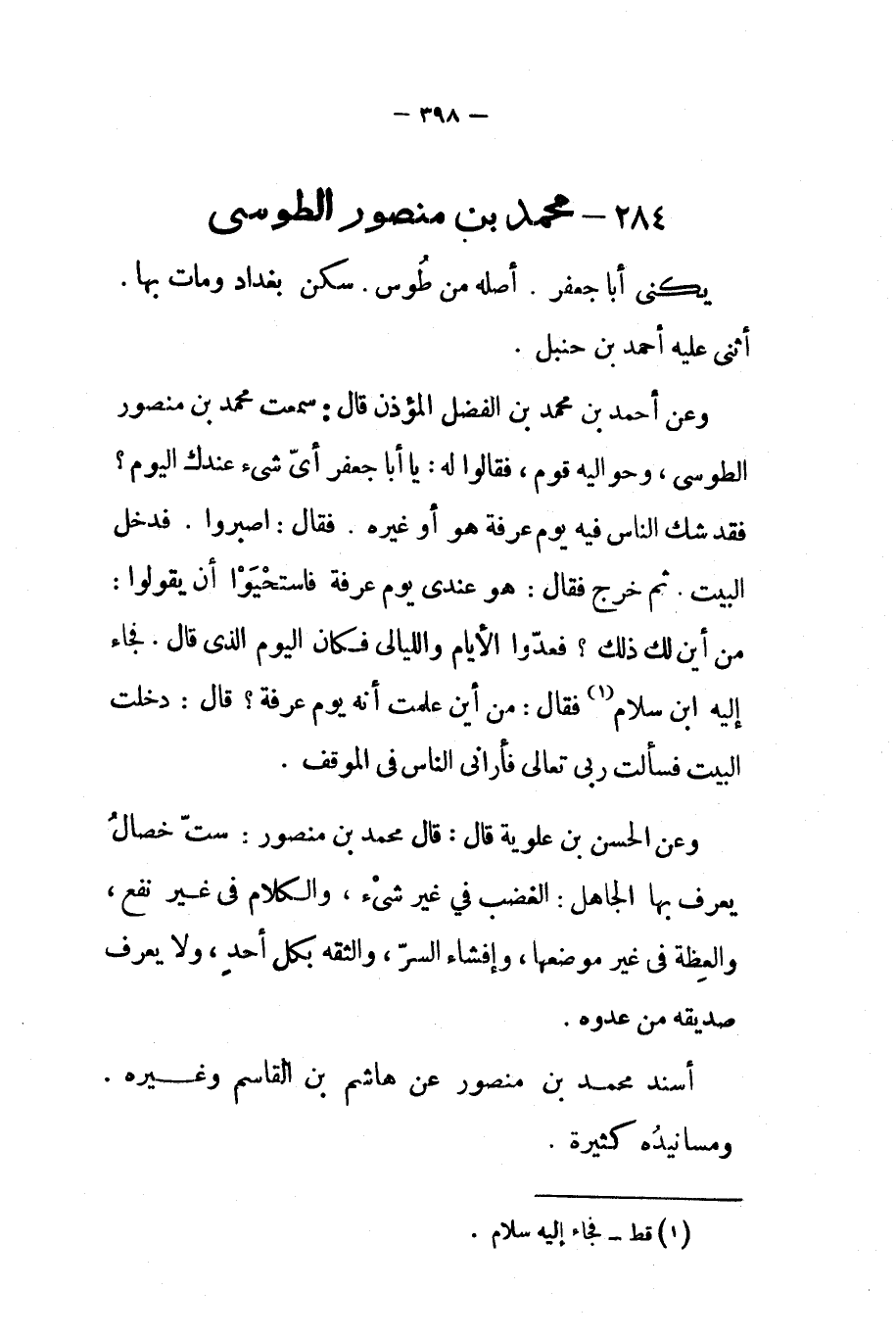 يكنى أبا جعفر أصله من طوس سكن بغداد ومات بها أثنى عليه أحمد بن حنبل