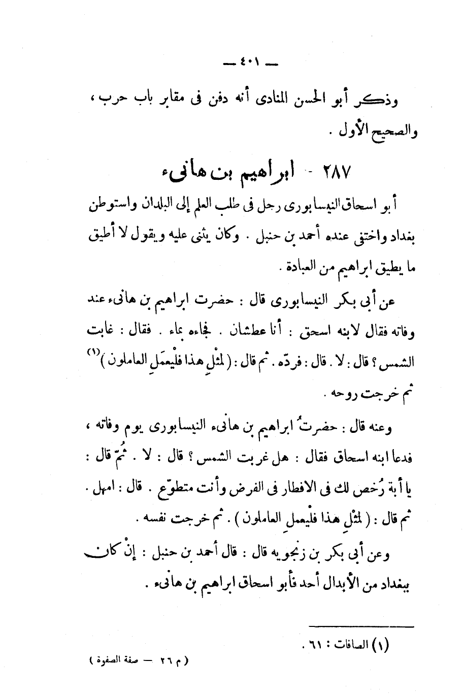 عن أبي بكر النيسابوري قال حضرت إبراهيم بن هانىء عند وفاته فقال لأبنه إسحق أنا عطشان فجاءه بماء فقال غابت الشمس قال لا قال فرده ثم قال لمثل هذا فليعمل العاملون ثم خرجت روحه