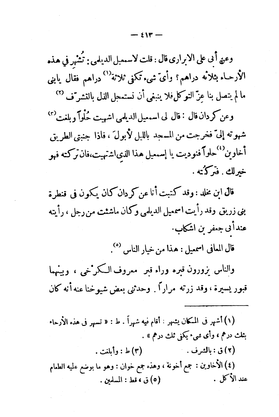وعن كردان قال قال لي اسمعيل الديلمي اشتهيت حلوا وبلغت شهوته إلي فخرجت من المسجد بالليل لأبول فإذا جنبتي الطريق أخاوين حلوا فنوديت يا إسمعيل هذا الذي اشتهيت فإن تركته فهو خير لك فتركته