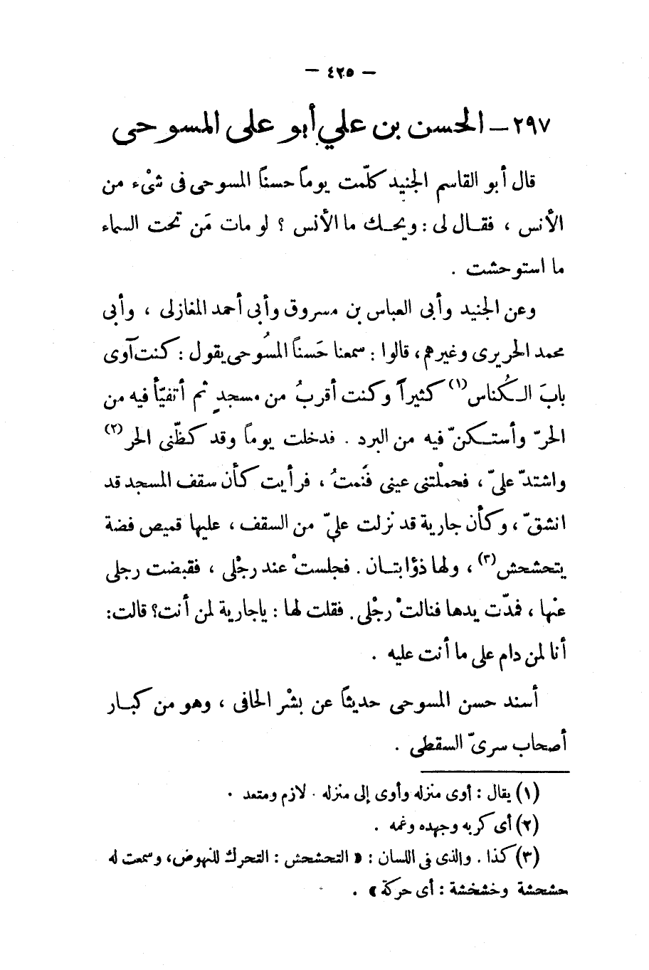 وعن الجنيد وأبي العباس بن مسروق وأبي أحمد المغازلي وأبي محمد الحريري وغيرهم قالوا سمعنا حسنا المسوحي يقول كنت آوى باب الكناس كثيرا وكنت أقرب من مسجد ثم أتفيأ فيه من الحر وأستكن فيه من البرد فدخلت يوما وقد كظني الحر واشتد علي فحملتني عيني فنمت فرأيت كأن سقف المسجد قد انشق وكأن جارية قد نزلت علي من السقف عليها قميص فضة يتحشحش ولها ذؤابتان فجلست عند رجلي فقبضت رجلي عنها فمدت يدها فنالت رجلي فقلت لها يا جارية لمن أنت قالت أنا لمن دام على ما أنت عليه