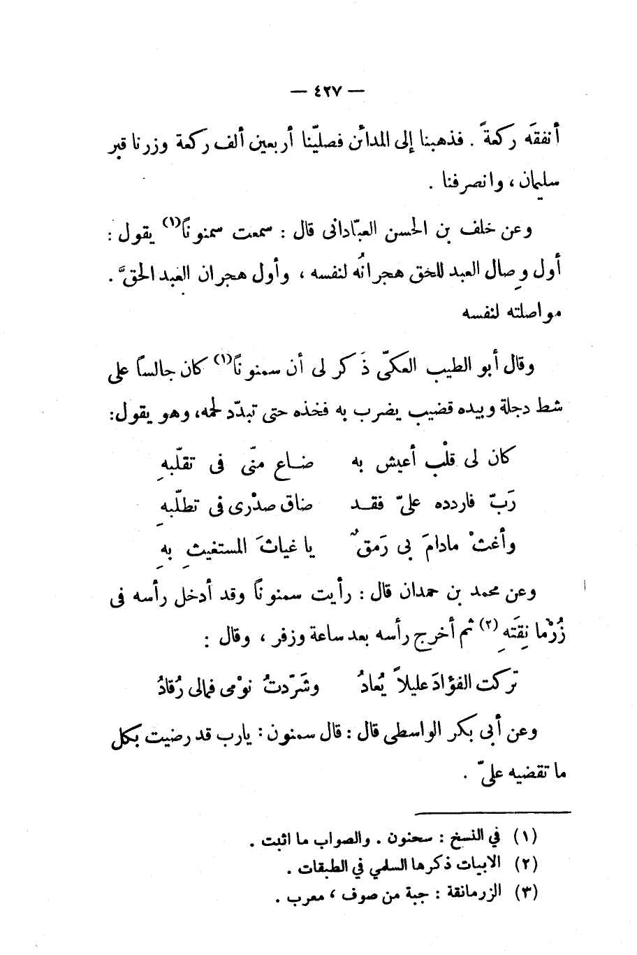 وعن محمد بن حمدان قال رأيت سمنونا وقد أدخل رأسه في زرمانقته ثم أخرج رأسه بعد ساعة وزفر وقال