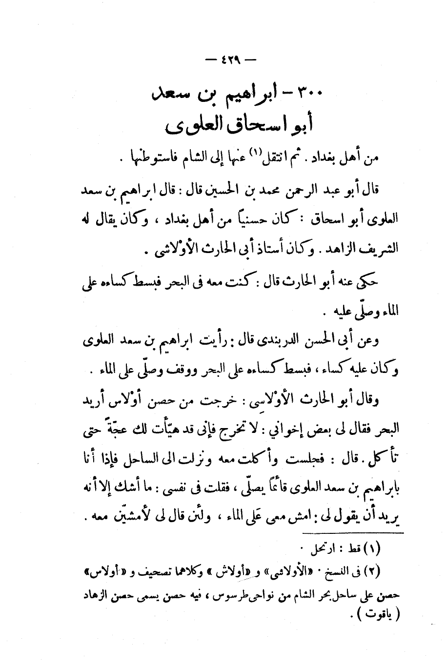 وقال أبو الحارث الأولاسي خرجت من حصن أولاس أريد البحر فقال لي بعض إخواني لا تخرج فإني قد هيأت لك عجة حتى تأكل قال فجلست وأكلت معه ونزلت إلى الساحل فإذا أنا بإبراهيم بن سعد العلوي قائما يصلي فقلت في نفسي ما أشك إلا أنه يريد أن يقول لي امش معي على الماء ولئن قال لي لأمشين معه