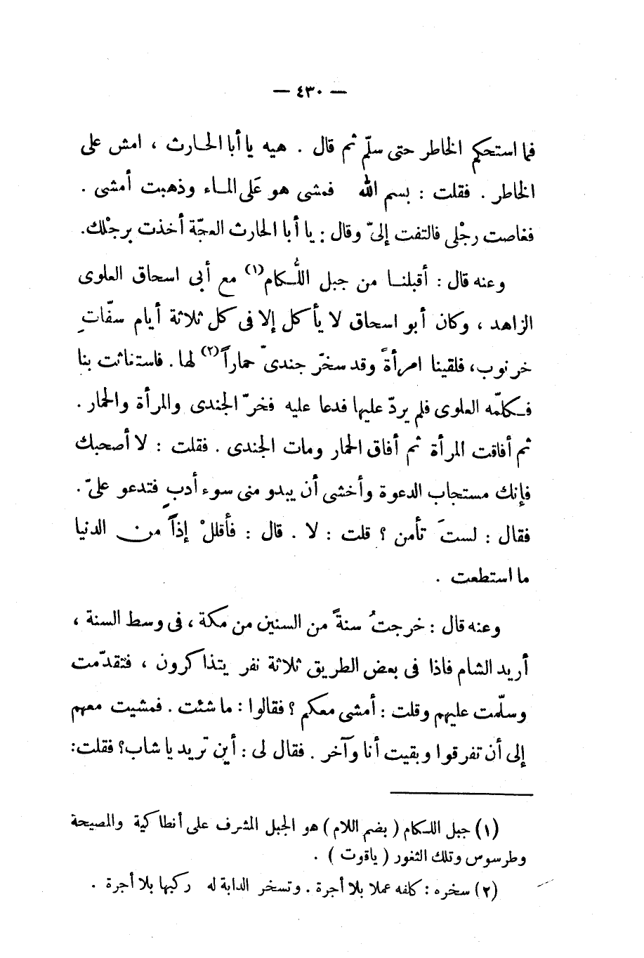 فما إستحكم الخاطر حتى سلم ثم قال هيه يا أبا الحارث امش على الخاطر فقلت بسم الله فمشى هو على الماء وذهبت أمشي فغاصت رجلي فالتفت إلي وقال يا أبا الحارث العجة أخذت برجلك