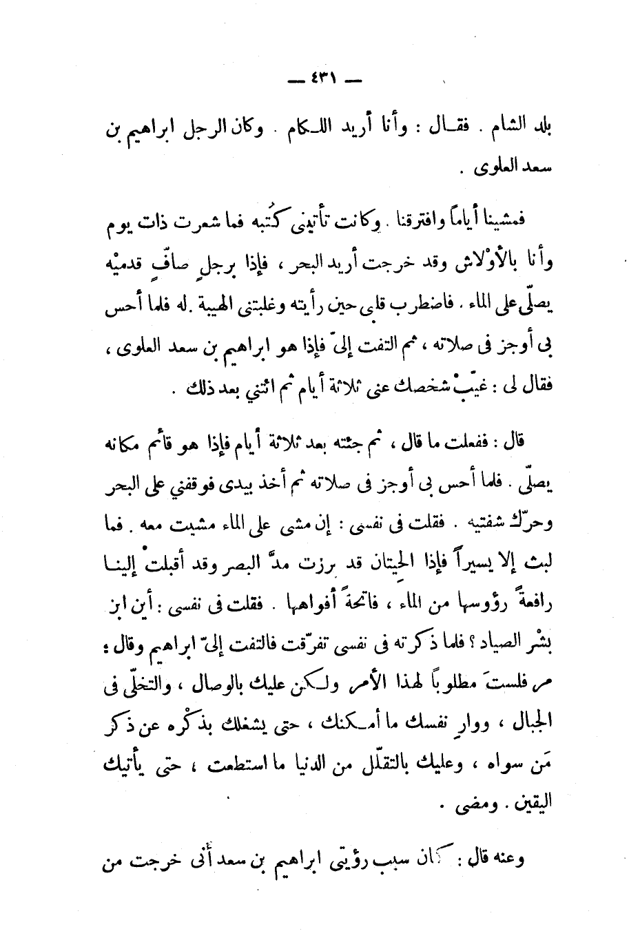 فمشينا أياما وافترقنا وكانت تأتيني كتبه فما شعرت ذات يوم وأنا بالأولاش وقد خرجت أريد البحر فإذا برجل صاف قدميه يصلي على الماء فاضطرب قلبي حين رأيته وغلبتني الهيبة له فلما أحس بي أوجز في صلاته ثم التفت إلى فإذا هو إبراهيم بن سعد العلوي فقال لي غيب شخصك عني ثلاثة أيام ثم ائتني بعد ذلك