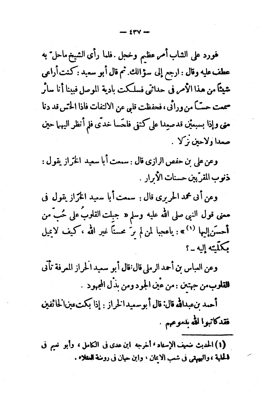 وعن أبي محمد الحريري قال سمعت أبا سعيد الخراز يقول في معنى قول النبي صلى الله عليه و سلم جبلت القلوب على حب من أحسن إليها يا عجبا لمن لم ير محسنا غير الله كيف لايميل بكليته إليه