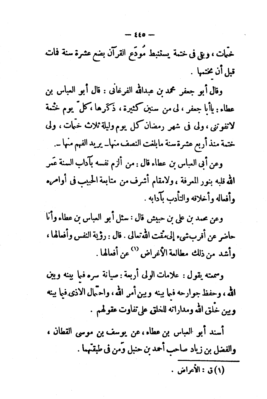 وقال أبو جعفر محمد بن عبد الله الفرغاني قال أبو العباس بن عطاء يا أبا جعفر لي من سنين كثيرة ذكرها كل يوم ختمة لاتفوتني ولي في شهر رمضان كل يوم وليلة ثلاث ختمات ولي ختمة منذ أربع عشرة سنة مابلغت النصف منها يريد الفهم منها