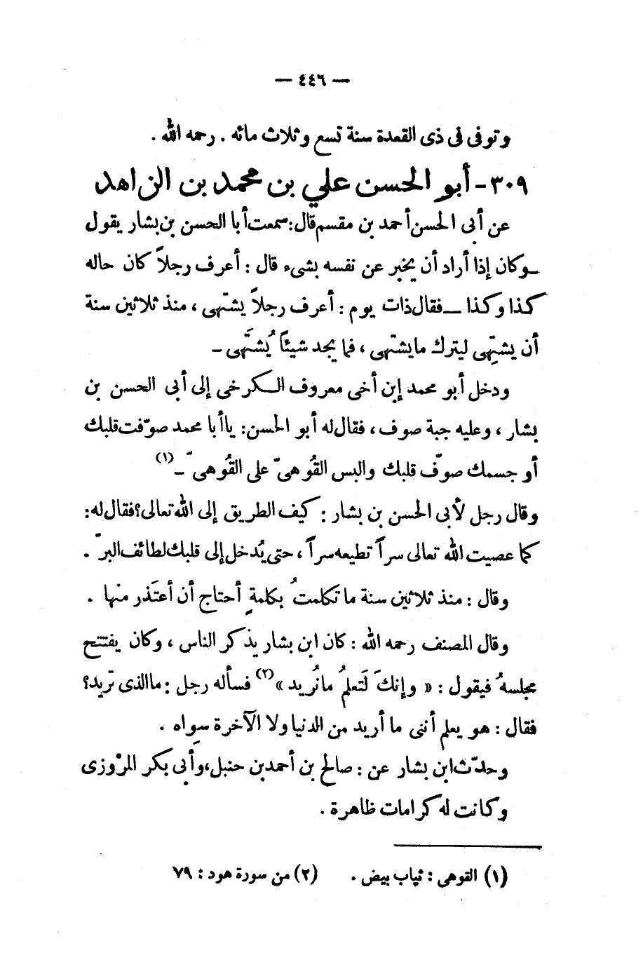 ودخل أبو محمد إبن أخي معروف الكرخي إلى أبي الحسن بن بشار وعليه جبة صوف فقال له أبو الحسن يا أبا محمد صوفت قلبك أو جسمك صوف قلبك والبس القوهي على القوهي