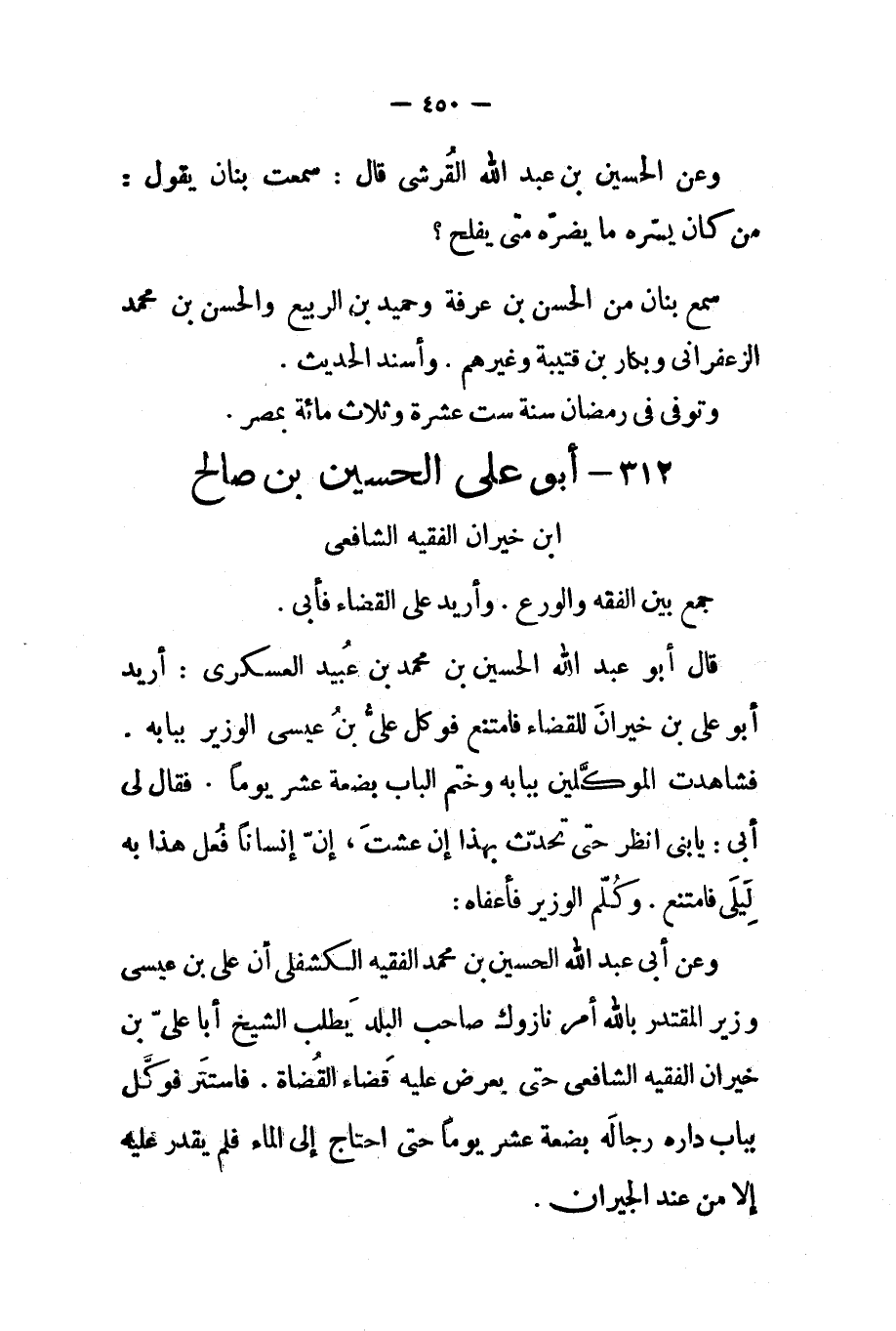 وعن أبي عبد الله الحسين بن محمد الفقيه الكشفلي أن علي بن عيسى وزير المقتدر بالله أمر نازوك صاحب البلد يطلب الشيخ أبا علي بن خيران الفقيه الشافعي حتى يعرض عليه قضاء القضاة فاستتر فوكل بباب داره رجاله بضعة عشر يوما حتى إحتاج إلى الماء فلم يقدر عليه إلا من عند الجيران