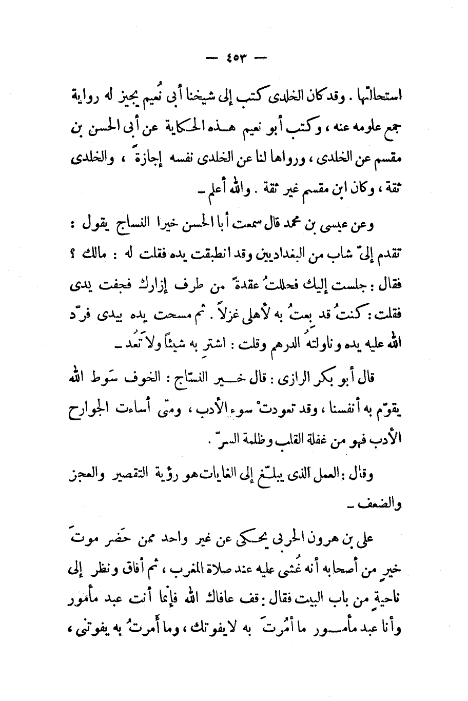 إستحالتها وقد كان الخلدي كتب إلى شيخنا أبي نعيم يجيز له رواية جمع علومه عنه وكتب أبو نعيم هذه الحكاية عن أبي الحسن بن مقسم عن الخلدي ورواها لنا عن الخلدي نفسه إجازة والخلدي ثقة وكان إبن مقسم غير ثقة والله أعلم
