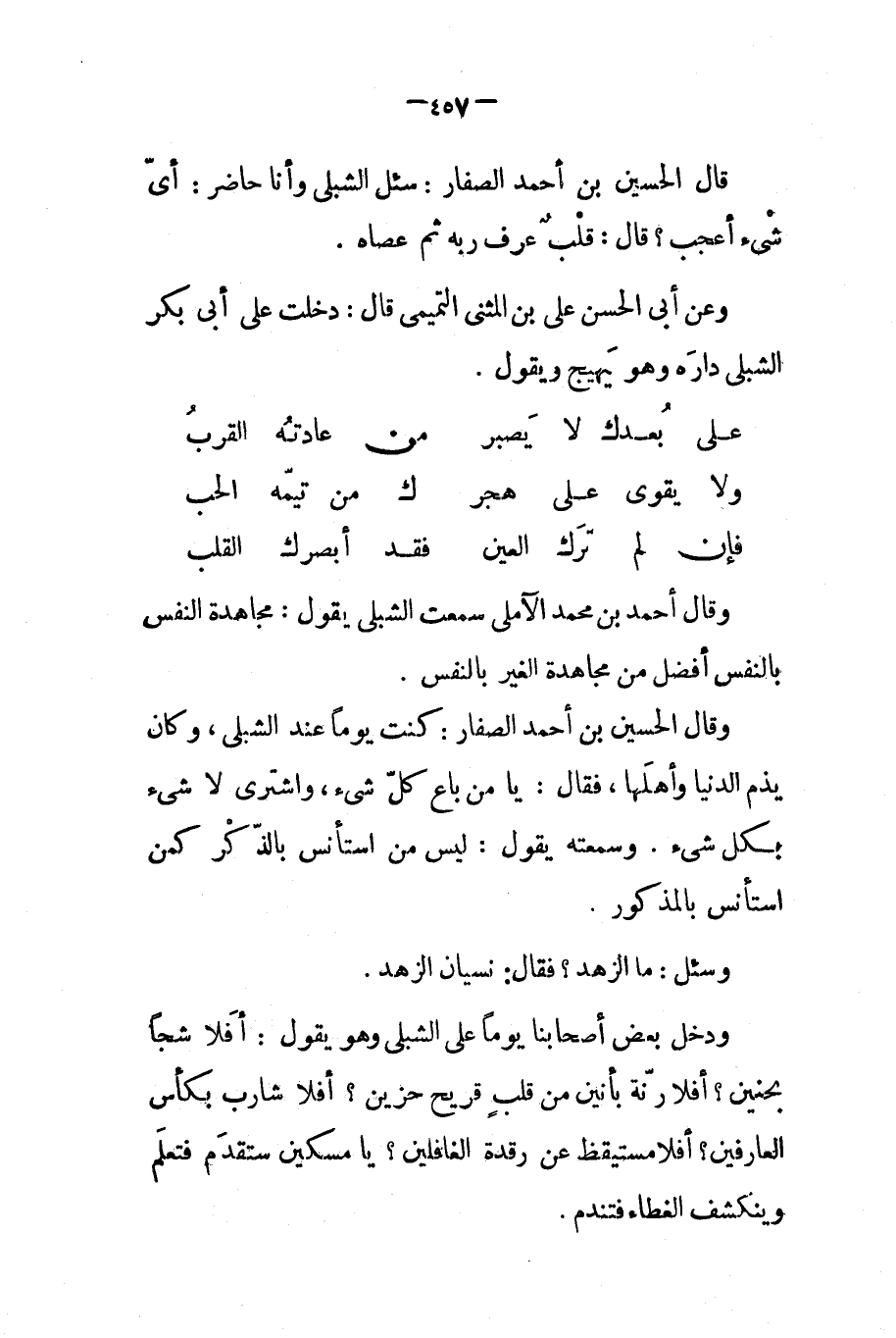 ودخل بعض أصحابنا يوما على الشبلي وهو يقول أفلا شجا بحنين أفلا رنة بأنين من قلب قريح حزين أفلا شارب بكأس العارفين أفلا مستيقظ عن رقدة الغافلين يا مسكين ستقدم فتعلم وينكشف الغطاء فتندم