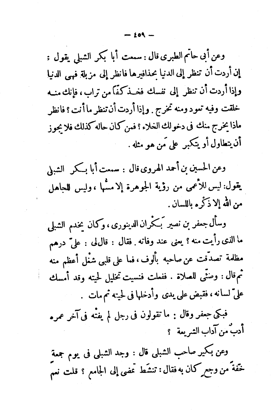 وعن بكير صاحب الشبلي قال وجد الشبلي في يوم جمعه خفة من وجع كان به فقال تنشط تمضي إلى الجامع قلت نعم