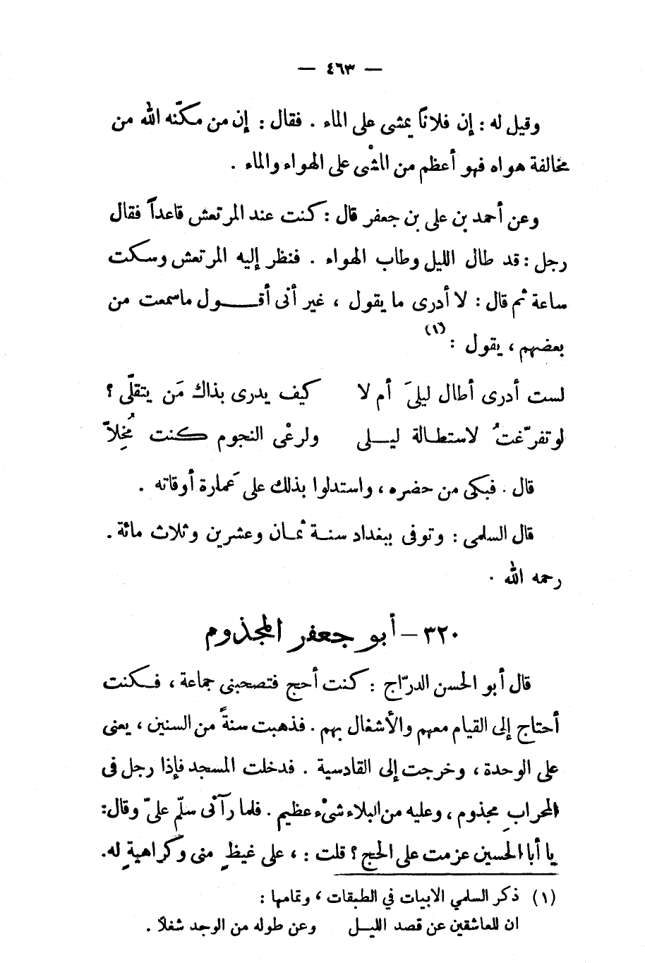 وعن أحمد بن علي بن جعفر قال كنت عند المرتعش قاعدا فقال رجل قد طال الليل وطاب الهواء فنظر إليه المرتعش وسكت ساعة ثم قال لاأدري ما يقول غير أني أقول ما سمعت من بعضهم يقول