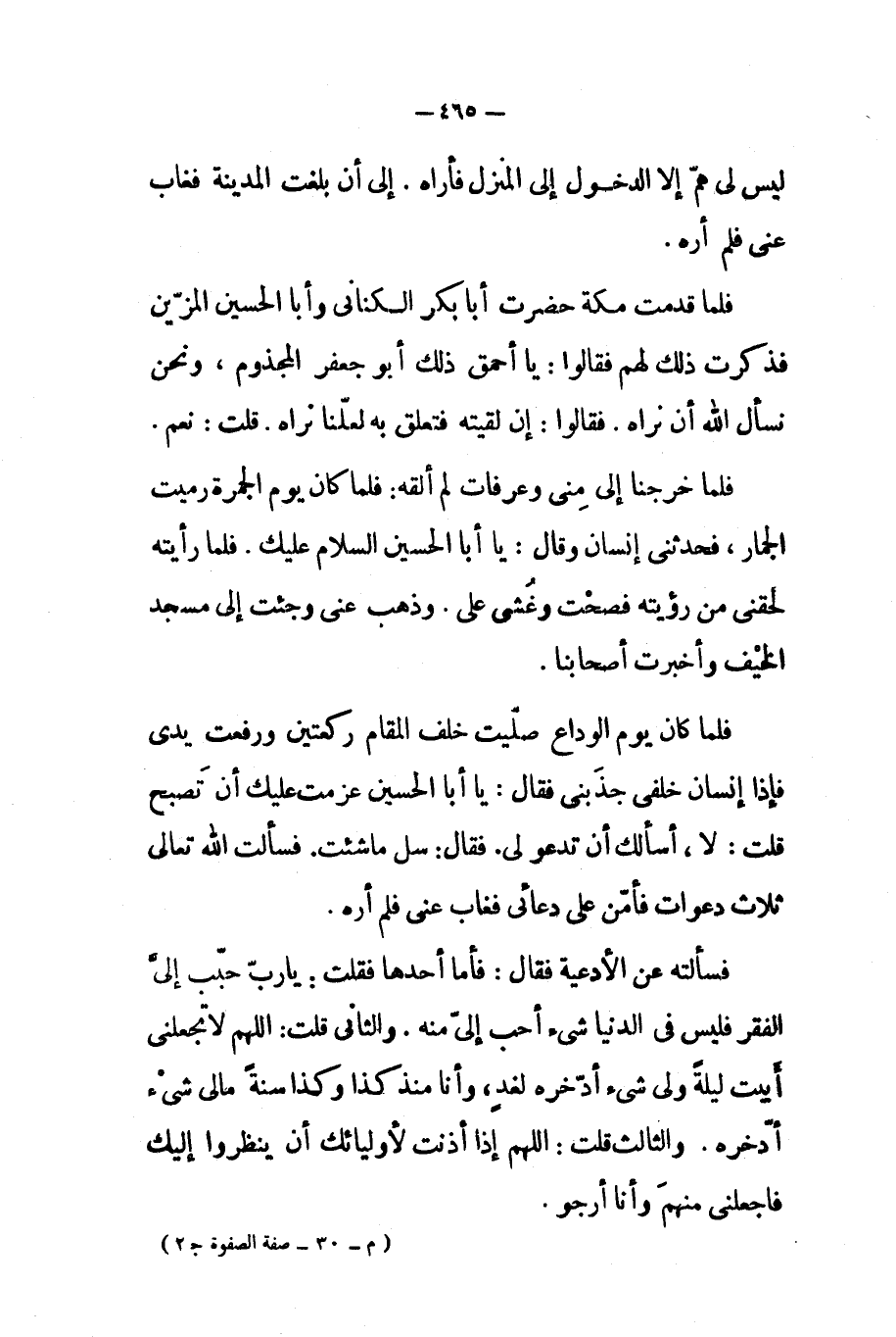 فلما كان يوم الوداع صليت خلف المقام ركعتين ورفعت يدي فإذا إنسان خلفي جذبني فقال يا أبا الحسين عزمت عليك أن تصبح قلت لا أسألك أن تدعو لي فقال سل ما شئت فسألت الله تعالى ثلاث دعوات فأمن على دعائي فغاب عني فلم أره