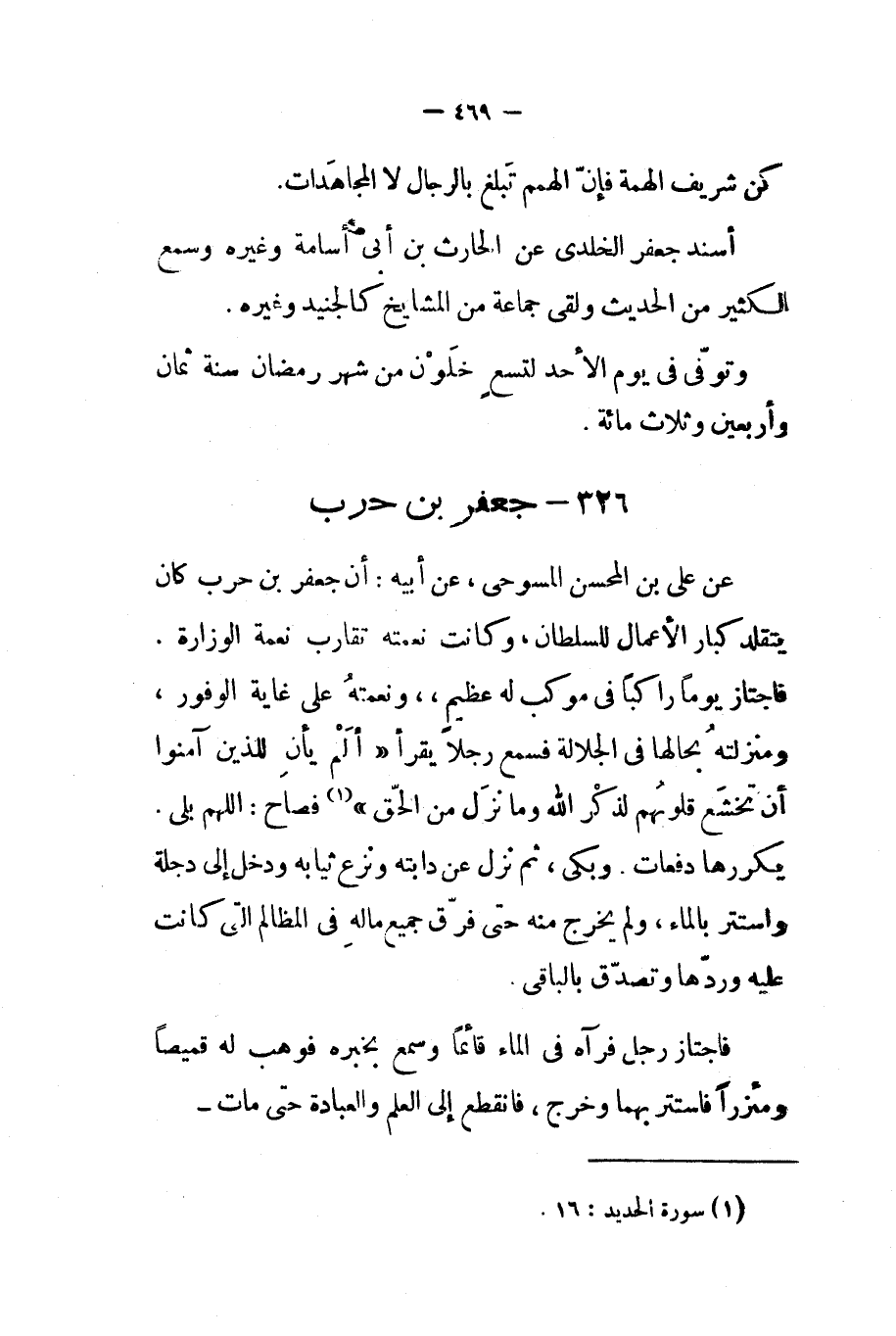 عن علي بن المحسن المسوحي عن أبيه أن جعفر بن حرب كان يتقلد كبار الأعمال للسلطان وكانت نعمته تقارب نعمة الوزارة فاجتاز يوما راكبا في موكب له عظيم ونعمته على غاية الوفور ومنزلته بحالها في الجلالة فسمع رجلا يقرأ ألم يأن للذين آمنوا أن تخشع قلوبهم لذكر الله وما نزل من الحق فصاح اللهم بلى يكررها دفعات وبكى ثم نزل عن دابته ونزع ثيابه ودخل إلى دجلة واستتر بالماء ولم يخرج منه حتى فرق جميع ماله في المظالم التي كانت عليه وردها وتصدق بالباقي
