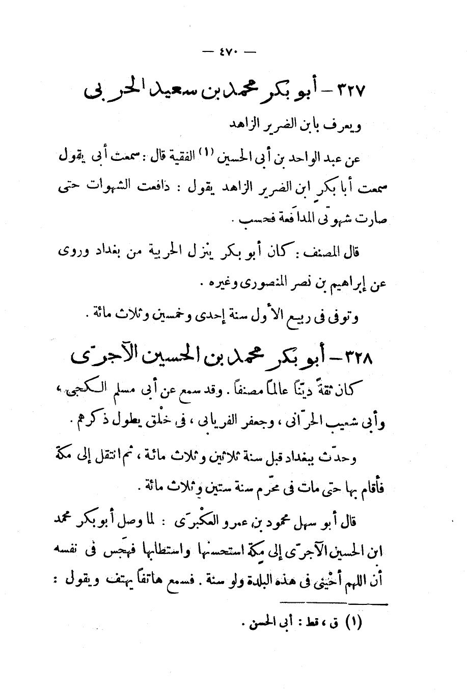 قال أبو سهل محمود بن عمرو العكبري لما وصل أبو بكر محمد ابن الحسين الآجري إلى مكة إستحسنها وإستطابها فهجس في نفسه أن اللهم أحيني في هذه البلدة ولو سنة فسمع هاتفا يهتف ويقول