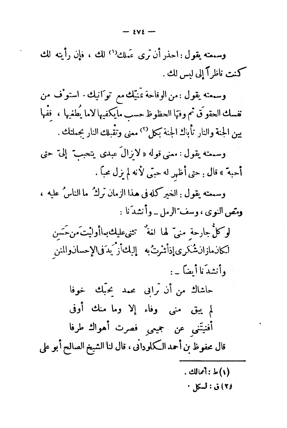 وسمعته يقول من الوقاحة تمنيك مع توانيك إستوف من نفسك الحقوق ثم وفها الحظوظ حسب مايكفيها لا مايطغيها قفها بين الجنة والنار تأباك الجنة بكل معنى وتقبلك النار بجملتك
