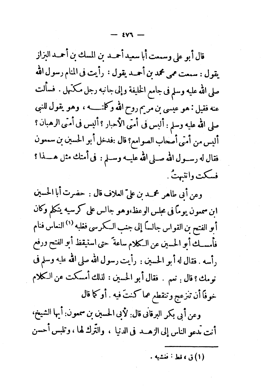 قال أبو علي وسمعت أبا سعيد أحمد بن المسك بن أحمد البزاز يقول سمعت عمي محمد بن أحمد يقول رأيت في المنام رسول الله صلى الله عليه و سلم في جامع الخليفة وإلى جانبه رجل مكتهل فسألت عنه فقيل هو عيسى بن مريم روح الله وكلمته وهو يقول للنبي صلى الله عليه و سلم أليس في أمتي الأحبار أليس في أمتي الرهبان أليس من أمتي أصحاب الصوامع قال فدخل أبو الحسين بن سمعون فقال له رسول الله صلى الله عليه و سلم في أمتك مثل هذا فسكت وانتبهت