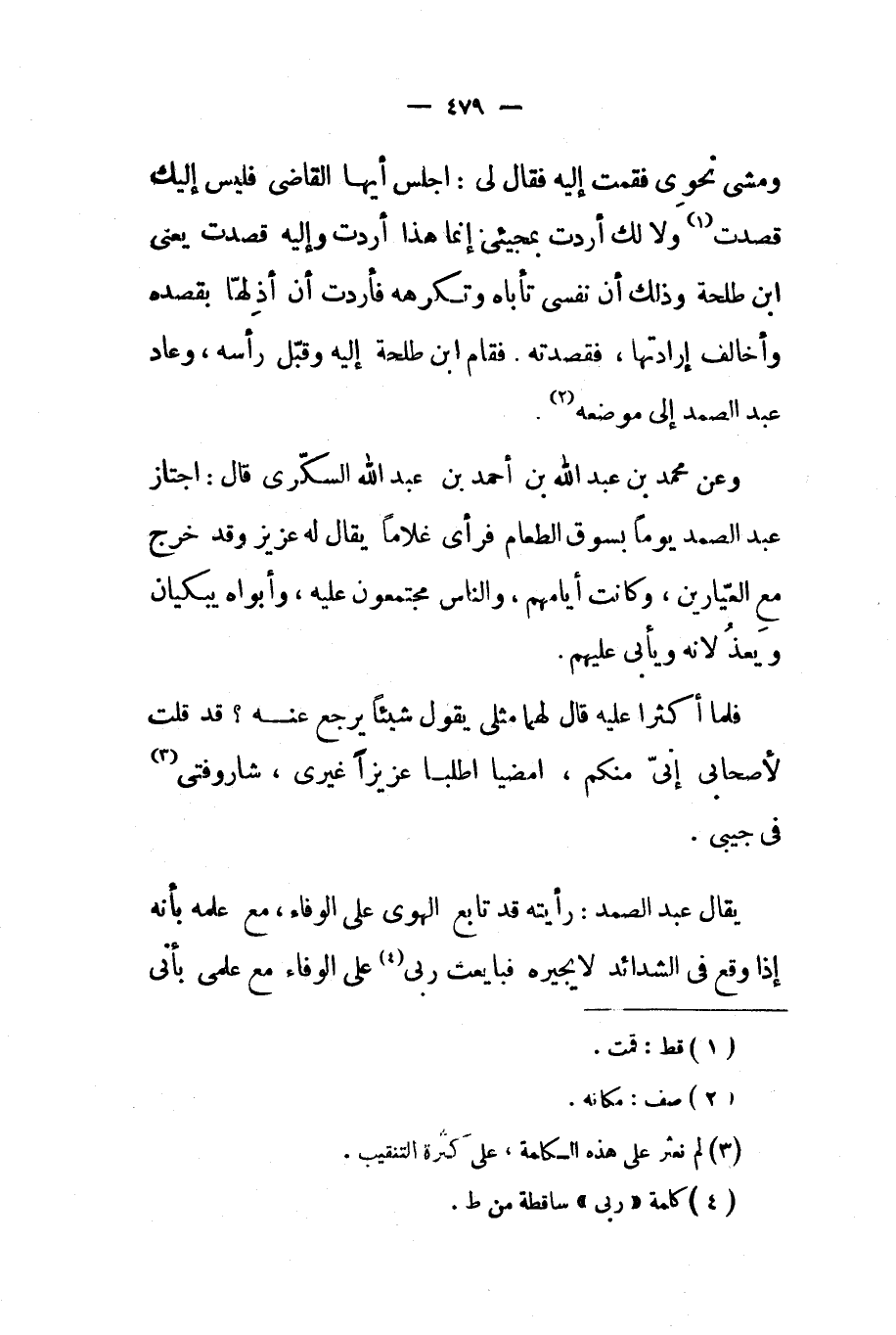 ومشى نحوي فقمت إليه فقال لي اجلس أيها القاضي فليس إليك قصدت ولا لك أردت بمجيئي إنما هذا أردت وإليه قصدت يعني إبن طلحة وذلك أن نفسي تأباه وتكرهه فأردت أن أذلها بقصده وأخالف إرادتها فقصدته فقام إبن طلحة إليه وقبل رأسه وعاد عبد الصمد إلى موضعه
