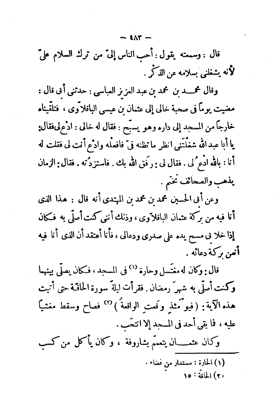 وقال محمد بن محمد بن عبد العزيز العباسي حدثني أبي قال مضيت يوما في صحبة خالي إلى عثمان بن عيسى الباقلاوي فتلقيناه خارجا من المسجد إلى داره وهو يسبح فقال له خالي ادع لي فقال يا أبا عبد الله شغلتني أنظر ما تظنه في فافعله وادع أنت لي فقلت له أنا بالله ادع لي فقال لي رفق الله بك فاستزدته فقال الزمان يذهب والصحائف تختم