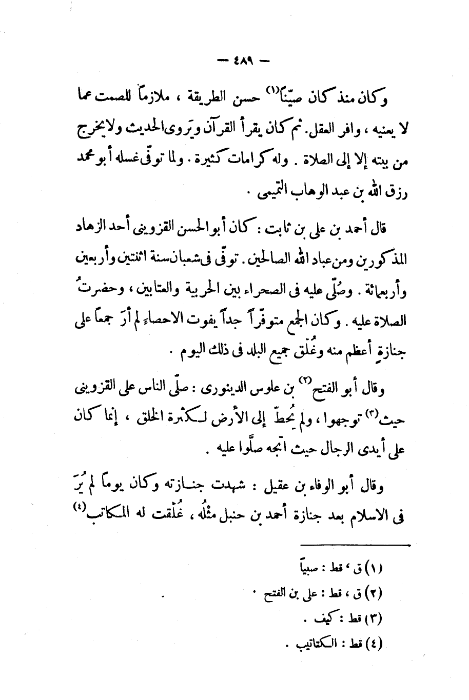 قال أحمد بن علي بن ثابت كان أبو الحسن القزويني أحد الزهاد المذكورين ومن عباد الله الصالحين توفي في شعبان سنة إثنتين وأربعين وأربعمائة وصلي عليه في الصحراء بين الحربية والعتابين وحضرت الصلاة عليه وكان الجمع متوافرا جدا يفوت الإحصاء لم أر جمعا على جنازة أعظم منه وغلق جميع البلد في ذلك اليوم