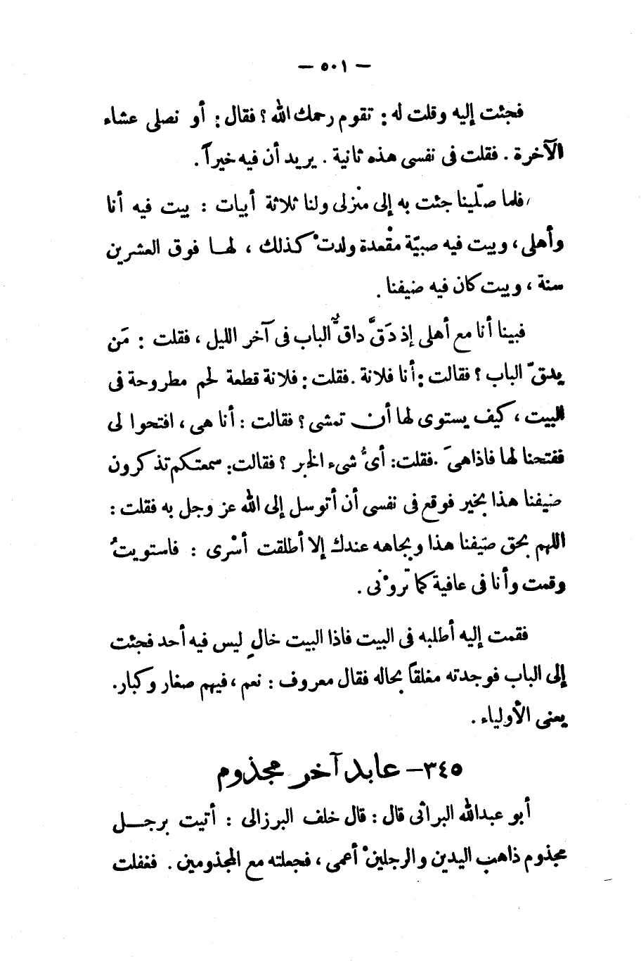 فلما صلينا جئت به إلى منزلي ولنا ثلاثة أبيات بيت فيه أنا وأهلي وبيت فيه صبية مقعدة ولدت كذلك لها فوق العشرين سنة وبيت كان فيه ضيفنا