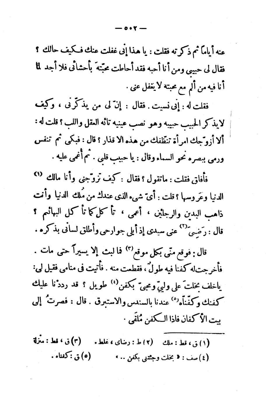 فقلت له إني نسيت فقال إن لي من يذكرني وكيف لا يذكر الحبيب حبيبه وهو نصب عينيه تائه العقل واللب قلت له ألا أزوجك امرأة تنظفك من هذه الأقذار قال فبكى ثم تنفس ورمى ببصره نحو السماء وقال يا حبيب قلبي ثم أغمي عليه