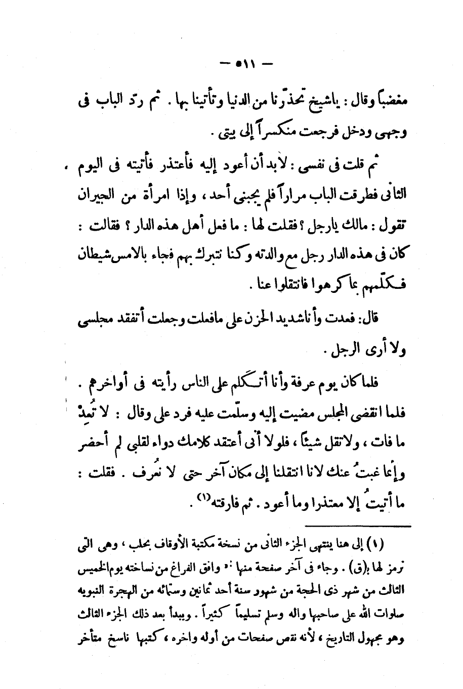 ثم قلت في نفسي لا بد أن أعود إليه فأعتذر فأتيته في اليوم الثاني فطرقت الباب مرارا فلم يجبني أحد وإذا امرأة من الجيران تقول مالك يا رجل فقلت لها ما فعل أهل هذه الدار فقالت كان في هذه الدار رجل مع والدته وكنا نتبرك بهم فجاء بالأمس شيطان فكلمهم بما كرهوا فانتقلوا عنا