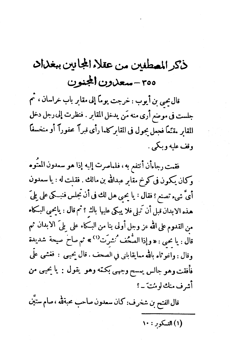 فقمت رجاء أن أنتفع به فلما صرت إليه إذا هو سعدون المعتوه وكان يكون في كوخ مقابر عبدالله بن مالك فقلت له يا سعدون أي شيء تصنع فقال يا يحيى هل لك في أن تجلس فنبكي على بلى هذه الأبدان قبل أن تبلى فلا يبكي عليها باك ثم قال يا يحيى البكاء من القدوم على الله عز و جل أولى بنا من البكاء على بلى الأبدان ثم قال يا يحيى وإذا الصحف نشرت ثم صاح صيحة شديدة وقال واغوثاه بالله مما يقابلني في الصحف قال يحيى فغشى علي فأفقت وهو جالس يمسح وجهي بكمه وهو يقول يا يحيى من أشرف منك لو مت