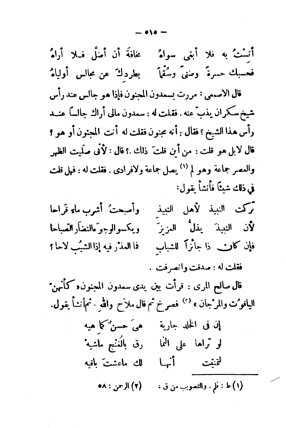 قال الأصمعي مررت بسعدون المجنون فإذا هو جالس عند رأس شيخ سكران يذب عنه فقلت له سعدون مالي أراك جالسا عند رأس هذا الشيخ فقال أنه مجنون فقلت له أنت المجنون أو هو قال لا بل هو قلت من أين قلت ذلك قال لأني صليت الظهر والعصر جماعة وهو لم يصل جماعة ولا فرادى فقلت له فهل قلت في ذلك شيئا فأنشأ يقول