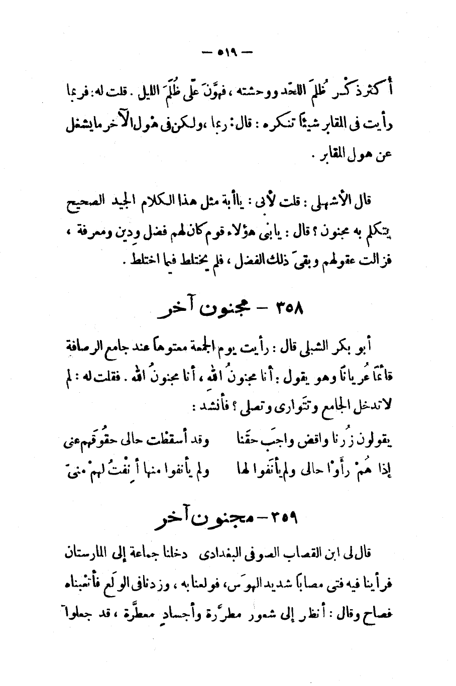 أبو بكر الشبلي قال رأيت يوم الجمعة معتوها عند جامع الرصافة قائما عريانا وهو يقول أنا مجنون الله أنا مجنون الله فقلت له لم لا تدخل الجامع وتتوارى وتصلي فأنشد