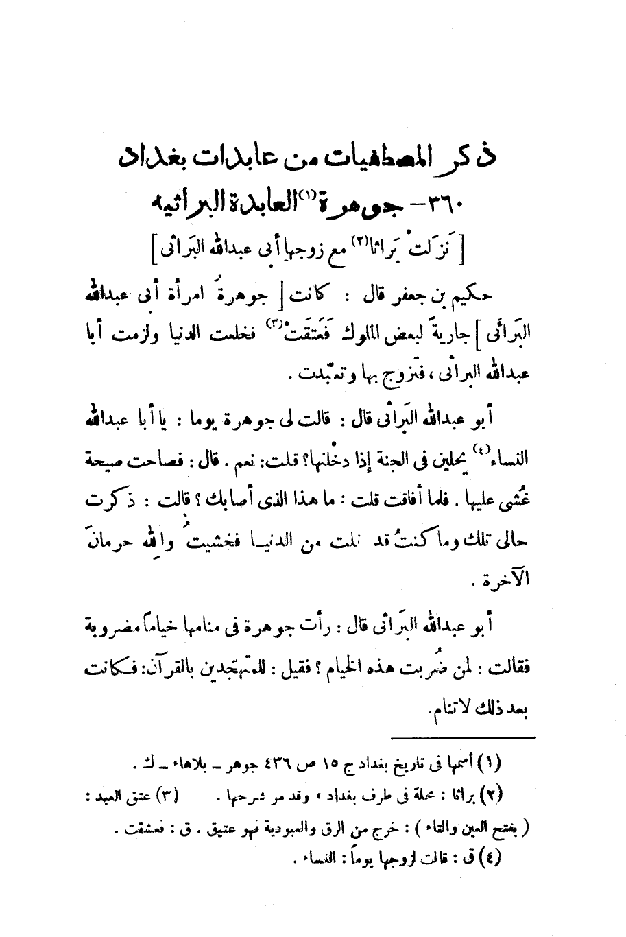 حكيم بن جعفر قال كانت جوهرة إمرأة أبي عبد الله البراثي جارية لبعض الملوك فعتقت فخلعت الدنيا ولزمت أبا عبد الله البراثي فتزوج بها وتعبدت