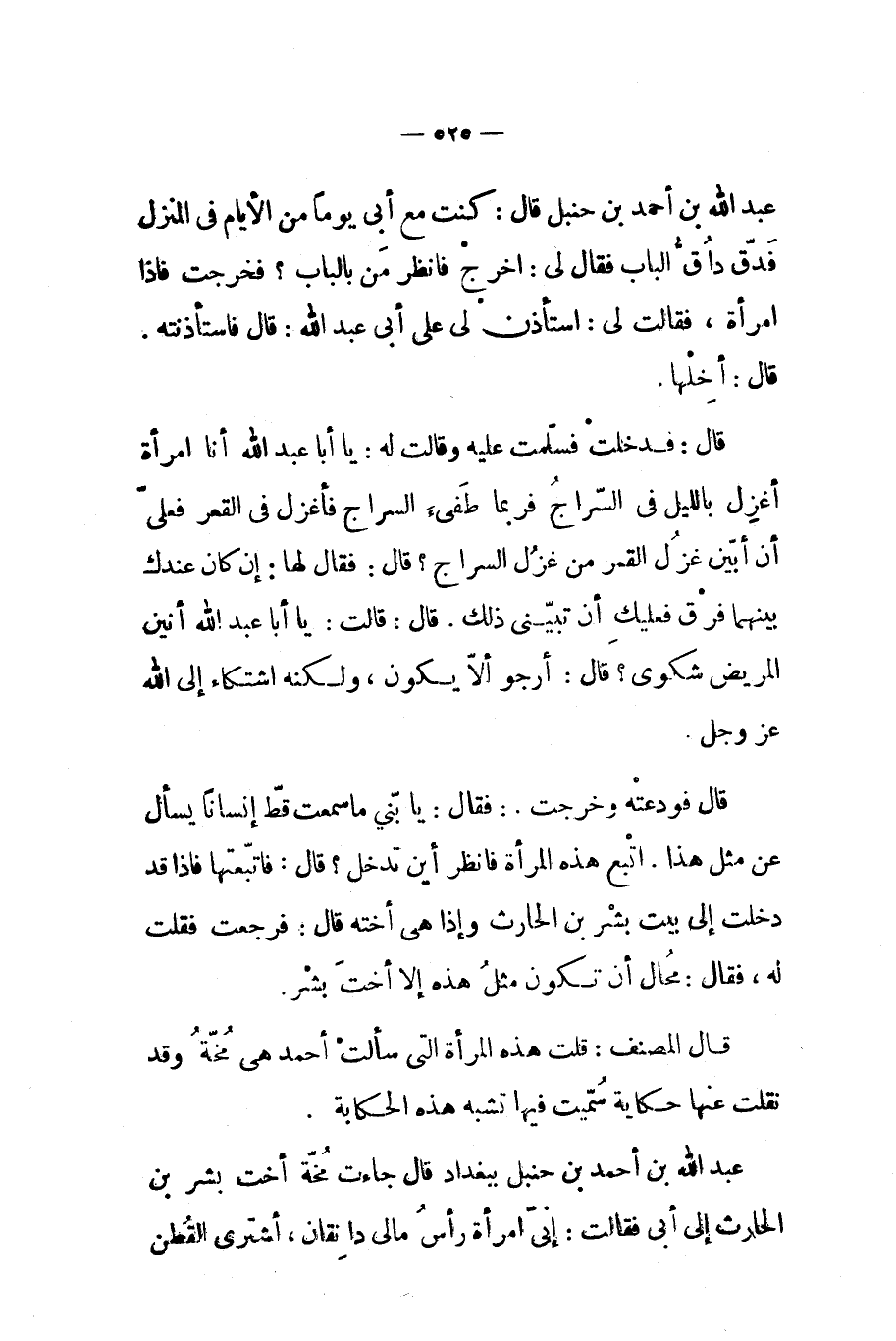 عبد الله بن أحمد بن حنبل قال كنت مع أبي يوما من الأيام في المنزل فدق داق الباب فقال لي أخرج فانظر من بالباب فخرجت فإذا إمرأة فقالت لي استأذن لي على أبي عبد الله قال فاستأذنته قال أخلها