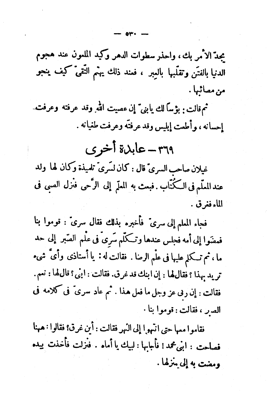 فجاء المعلم إلى سري فأخبره بذلك فقال سري قوموا بنا فمضوا إلى أمه فجلس عندها وتكلم سري في علم الصبر إلى حد ما ثم تكلم عليها في علم الرضا فقالت له يا أستاذي وأي شيء تريد بهذا فقال لها إن إبنك قد غرق فقالت إبني قال لها نعم فقالت إن ربي عز و جل ما فعل هذا ثم عاد سري في كلامه في الصبر فقالت قوموا بنا