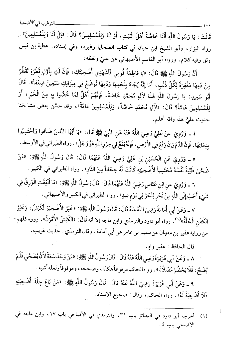 رَوَاهُ الْبَزَّار وَأَبُو الشَّيْخ ابْن حبَان فِي كتاب الضَّحَايَا وَغَيره وَفِي إِسْنَاده عَطِيَّة بن قيس وثق وَفِيه كَلَام