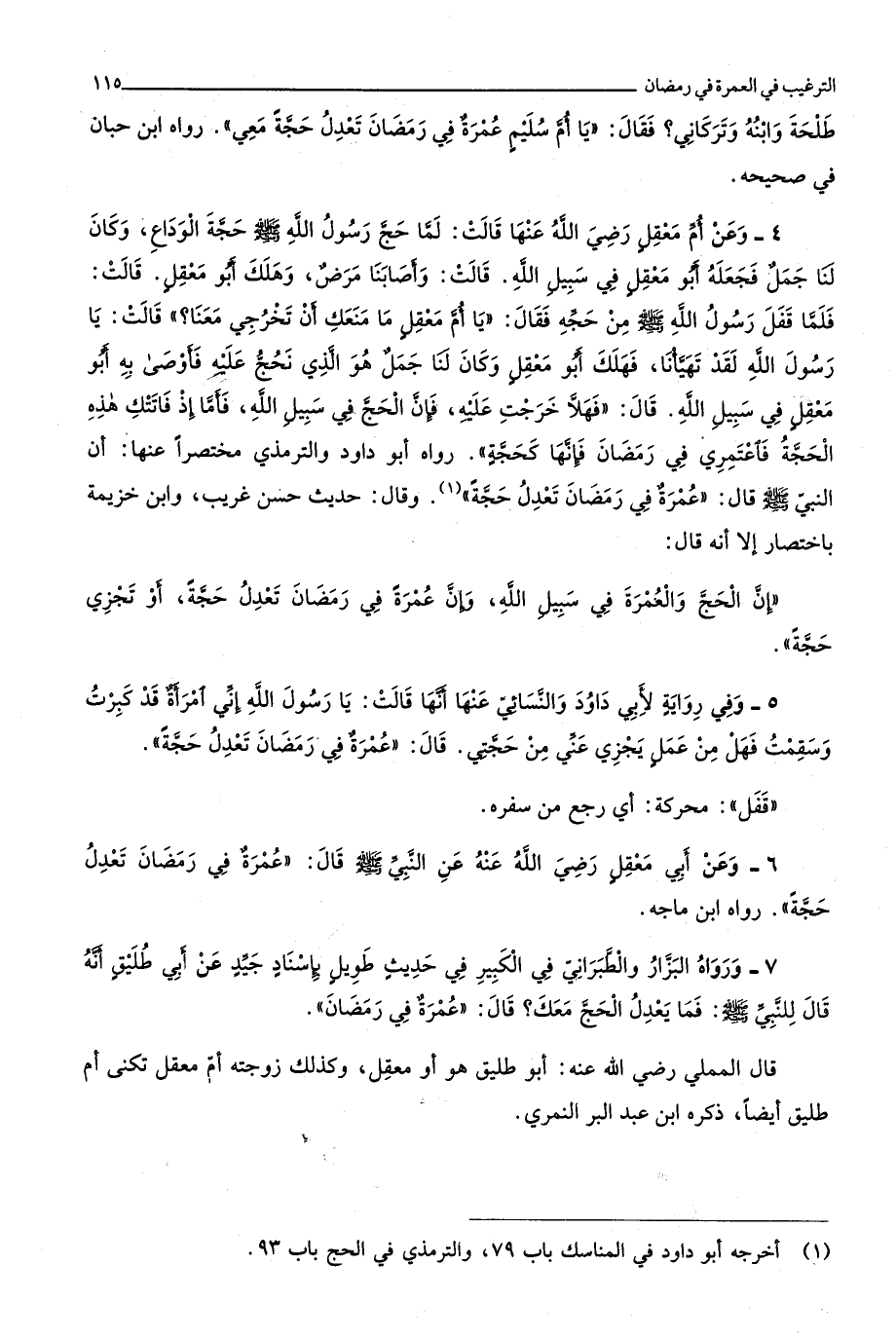 طَلْحَة وَابْنه وتركاني فَقَالَ يَا أم سليم عمْرَة فِي رَمَضَان تعدل حجَّة معي