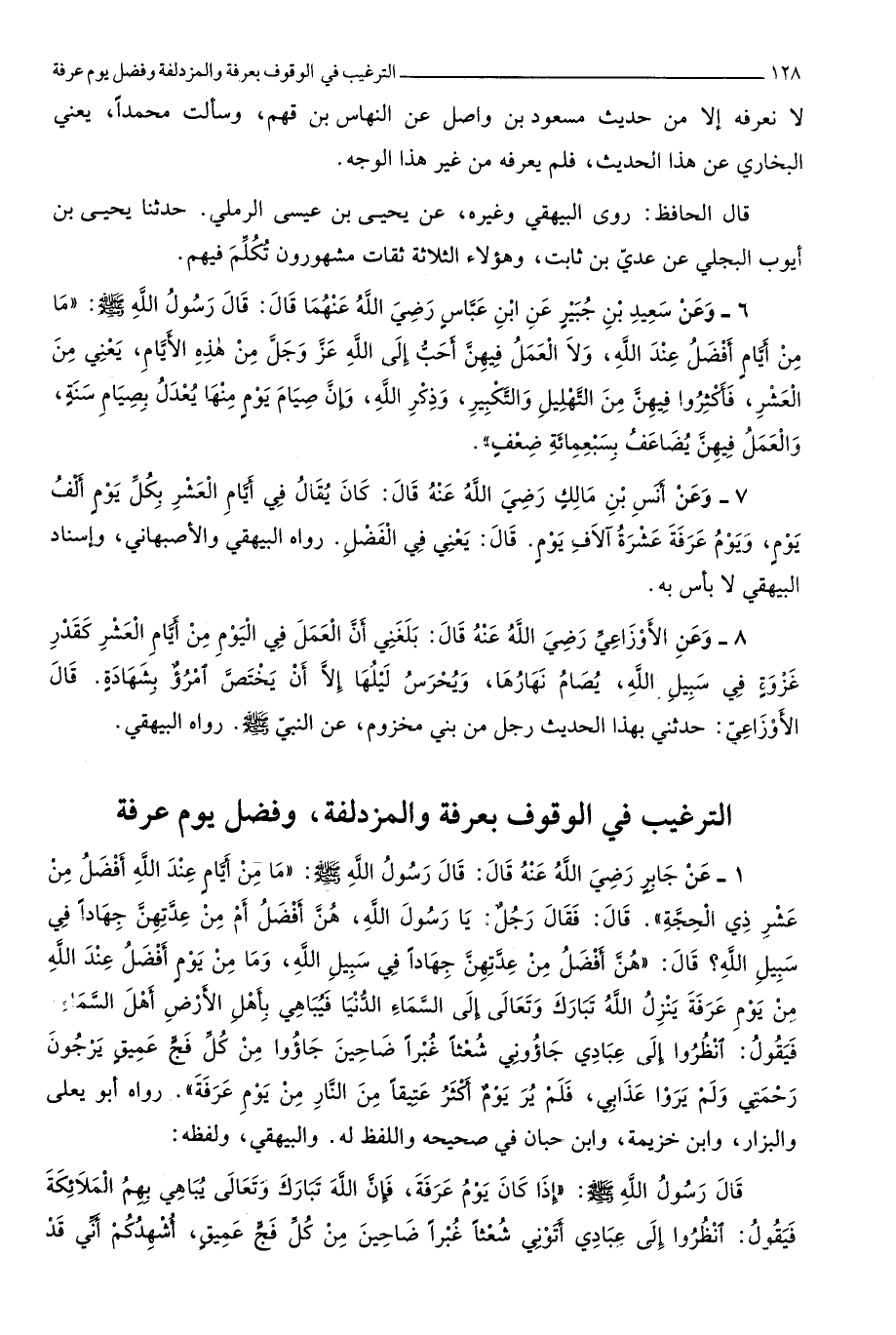قَالَ فَقَالَ رجل يَا رَسُول الله هن أفضل أم من عدتهن جهادا فِي سَبِيل الله قَالَ هن أفضل من عدتهن جهادا فِي سَبِيل الله وَمَا من يَوْم أفضل عِنْد الله من يَوْم عَرَفَة ينزل الله تبَارك وَتَعَالَى إِلَى السَّمَاء الدُّنْيَا فيباهي بِأَهْل الأَرْض أهل السَّمَاء فَيَقُول انْظُرُوا إِلَى عبَادي جاؤوني شعثا غبرا ضاحين جاؤوا من كل فج عميق يرجون رَحْمَتي وَلم يرَوا عَذَابي فَلم ير يَوْم أَكثر عتيقا من النَّار من يَوْم عَرَفَة
