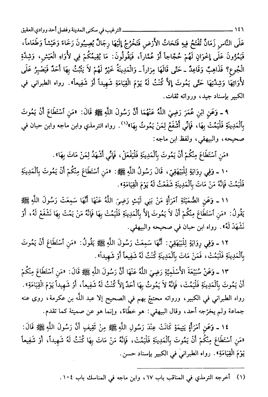رَوَاهُ التِّرْمِذِيّ وَابْن مَاجَه وَابْن حبَان فِي صَحِيحه وَالْبَيْهَقِيّ وَلَفظ ابْن مَاجَه من اسْتَطَاعَ مِنْكُم أَن يَمُوت بِالْمَدِينَةِ فَلْيفْعَل فَإِنِّي أشهد لمن مَاتَ بهَا