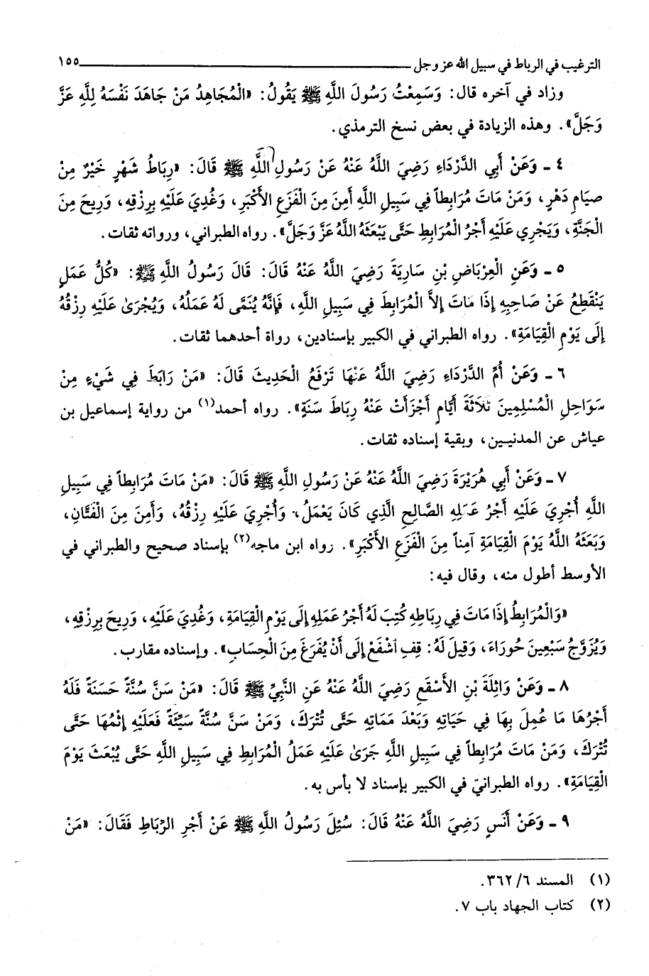 رَوَاهُ ابْن مَاجَه بِإِسْنَاد صَحِيح وَالطَّبَرَانِيّ فِي الْأَوْسَط أطول مِنْهُ وَقَالَ فِيهِ والمرابط إِذا مَاتَ فِي رباطه كتب لَهُ أجر عمله إِلَى يَوْم الْقِيَامَة وغدي عَلَيْهِ وريح برزقه ويزوج سبعين حوراء وَقيل لَهُ قف اشفع إِلَى أَن يفرغ من الْحساب