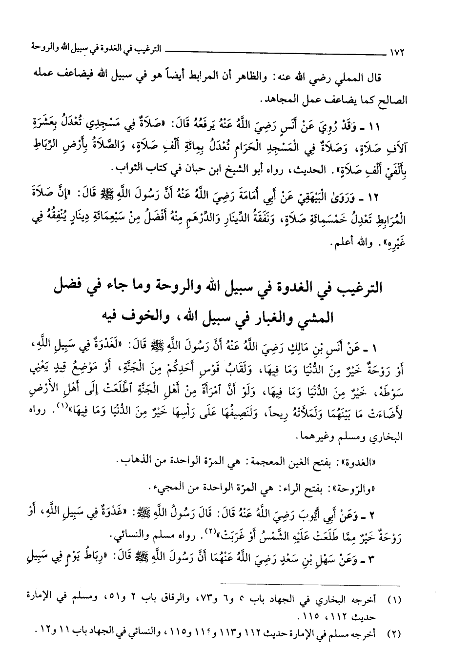 6 - التَّرْغِيب فِي الغدوة فِي سَبِيل الله والروحة وَمَا جَاءَ فِي فضل الْمَشْي وَالْغُبَار فِي سَبِيل الله وَالْخَوْف فِيهِ