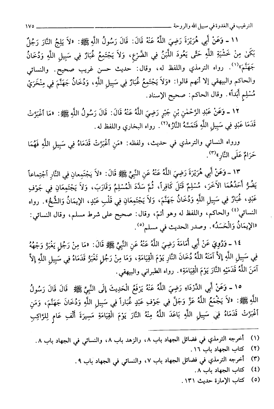 1996 - وَرُوِيَ عَن أبي أُمَامَة رَضِي الله عَنهُ عَن النَّبِي صلى الله عَلَيْهِ وَسلم قَالَ مَا من رجل يغبر وَجهه فِي سَبِيل الله إِلَّا آمنهُ الله دُخان النَّار يَوْم الْقِيَامَة وَمَا من رجل تغبر قدماه فِي سَبِيل الله إِلَّا آمن الله قَدَمَيْهِ النَّار يَوْم الْقِيَامَة
