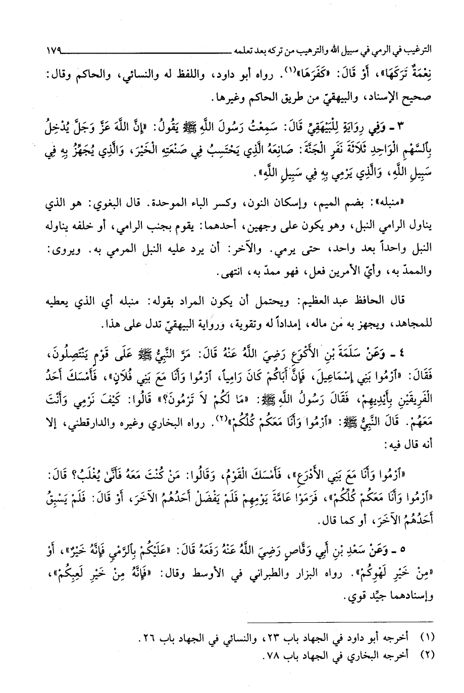 قَالَ الْحَافِظ عبد الْعَظِيم وَيحْتَمل أَن يكون المُرَاد بقوله منبله أَي الَّذِي يُعْطِيهِ للمجاهد ويجهز بِهِ من مَاله إمدادا لَهُ وتقوية وَرِوَايَة الْبَيْهَقِيّ تدل على هَذَا