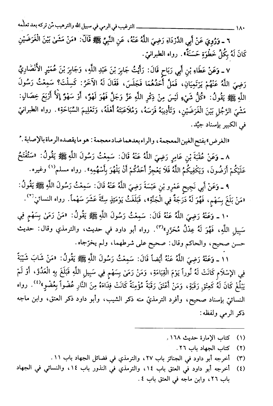 2017 - وَعنهُ رَضِي الله عَنهُ قَالَ سَمِعت رَسُول الله صلى الله عَلَيْهِ وَسلم يَقُول من رمى بِسَهْم فِي سَبِيل الله فَهُوَ لَهُ عدل مُحَرر
