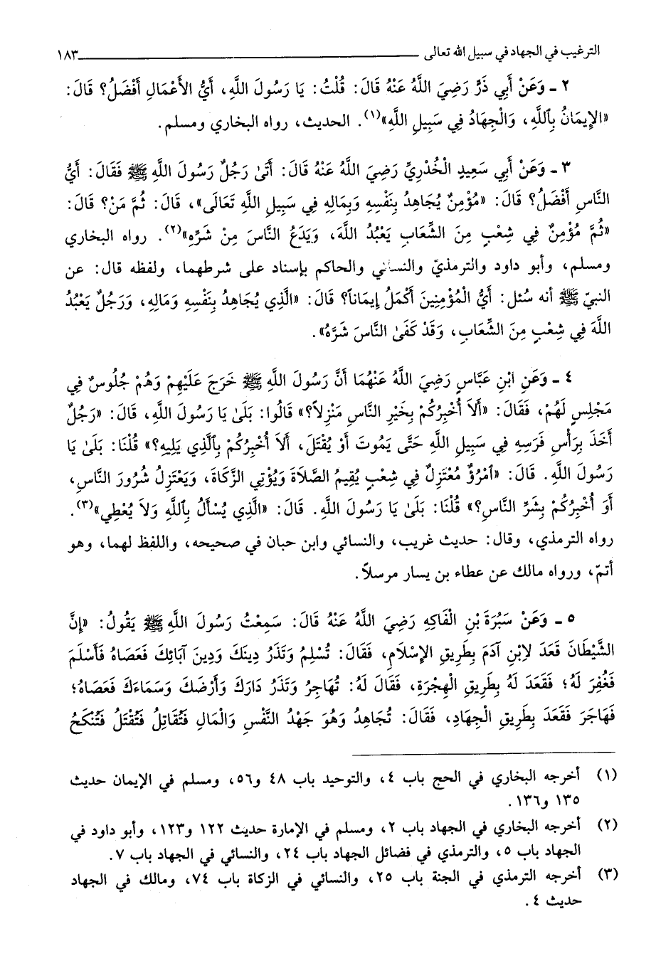 رَوَاهُ البُخَارِيّ وَمُسلم وَأَبُو دَاوُد وَالتِّرْمِذِيّ وَالنَّسَائِيّ وَالْحَاكِم بِإِسْنَاد على شَرطهمَا وَلَفظه قَالَ عَن النَّبِي صلى الله عَلَيْهِ وَسلم أَنه سُئِلَ أَي الْمُؤمنِينَ أكمل إِيمَانًا قَالَ الَّذِي يُجَاهد بِنَفسِهِ وَمَاله وَرجل يعبد الله فِي شعب من الشعاب وَقد كفى النَّاس شَره