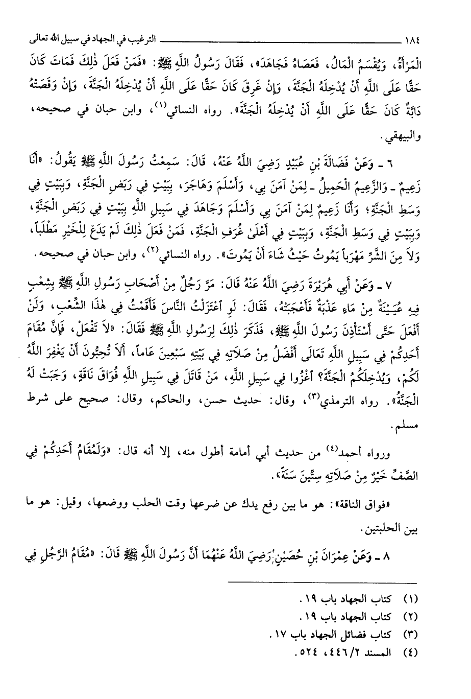 2034 - وَعَن فضَالة بن عبيد رَضِي الله عَنهُ قَالَ سَمِعت رَسُول الله صلى الله عَلَيْهِ وَسلم يَقُول أَنا زعيم والزعيم الْحميل لمن آمن بِي وَأسلم وَهَاجَر بِبَيْت فِي ربض الْجنَّة وببيت فِي وسط الْجنَّة وَأَنا زعيم لمن آمن بِي وَأسلم وجاهد فِي سَبِيل الله بِبَيْت فِي ربض الْجنَّة وببيت فِي وسط الْجنَّة وببيت فِي أَعلَى غرف الْجنَّة فَمن فعل ذَلِك لم يدع للخير مطلبا وَلَا من الشَّرّ مهربا يَمُوت حَيْثُ شَاءَ أَن يَمُوت